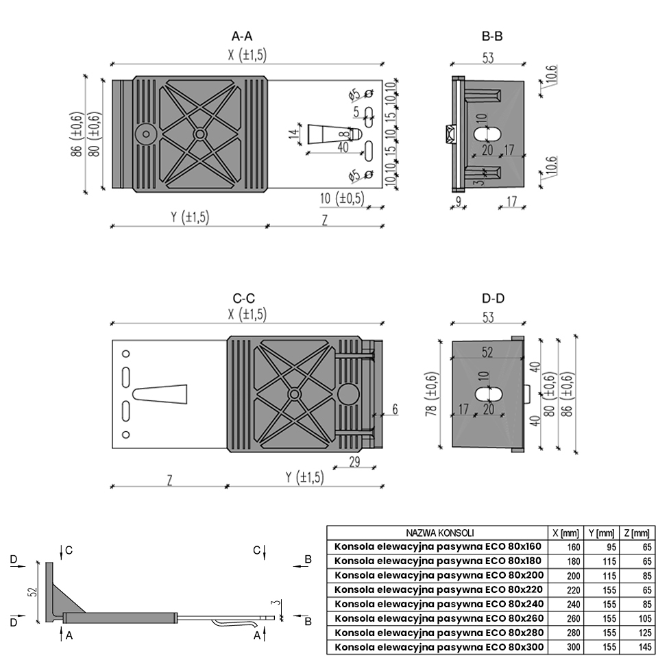 Model ECO 80x300 należy do serii konsol pasywnych dostępnych w wysięgach od 160 mm do 300 mm, ze stopniowaniem co 20 mm.